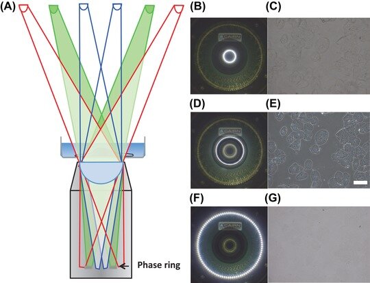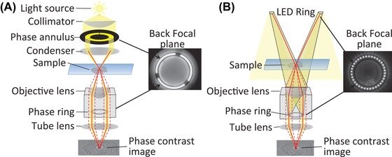 Traditional phase-contrast microscopy relies on a combination of a condenser lens and a ring aperture to realize phase-contrast. The UC2 system brings an innovative shift to this classic setup by replacing the lens-based illumination system with an LED ring. This LED-based setup, while non-conventional, provides contrast levels remarkably comparable to its lens-based counterparts.