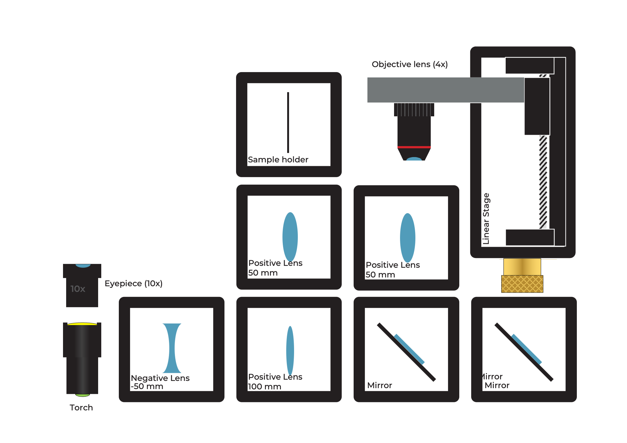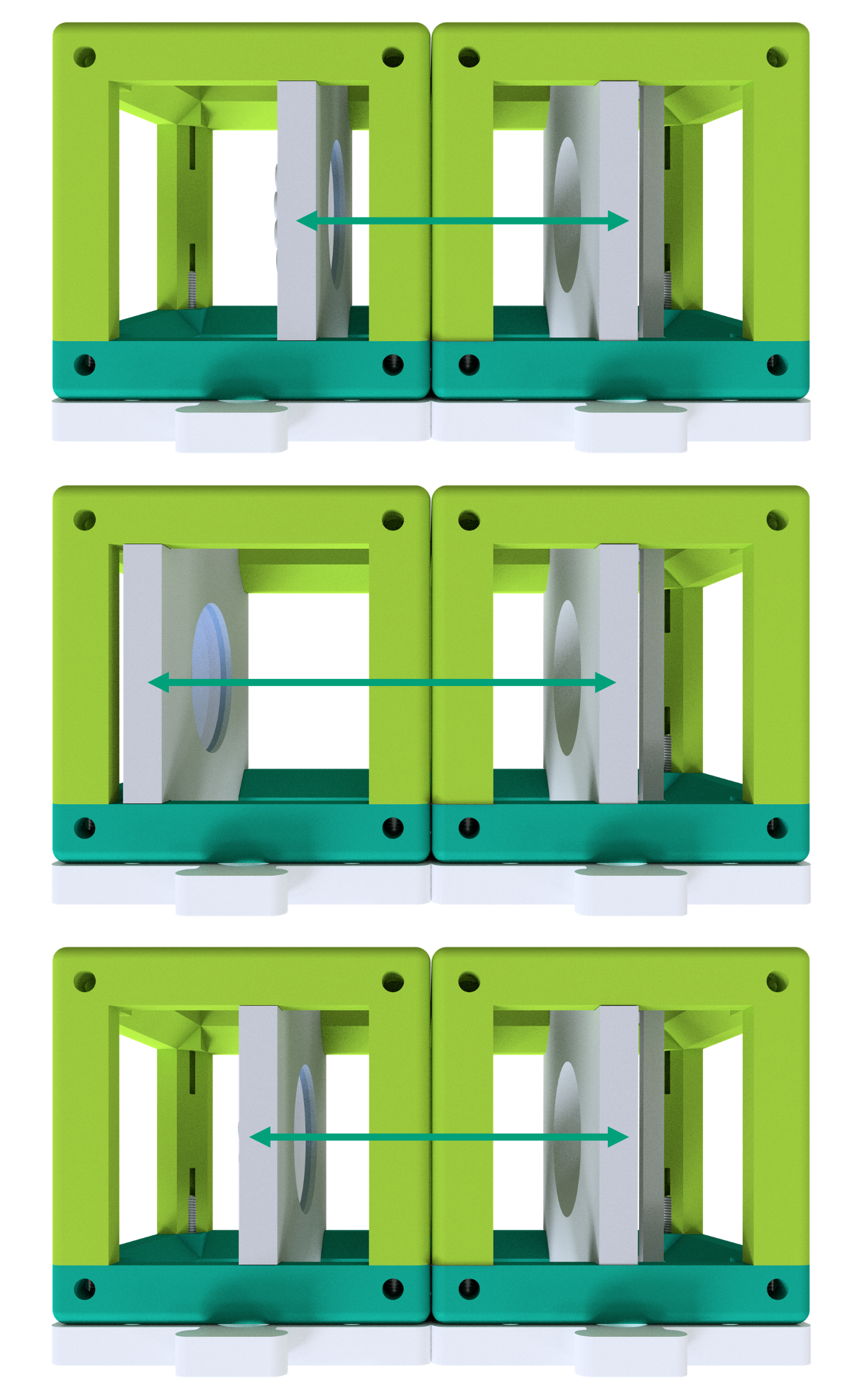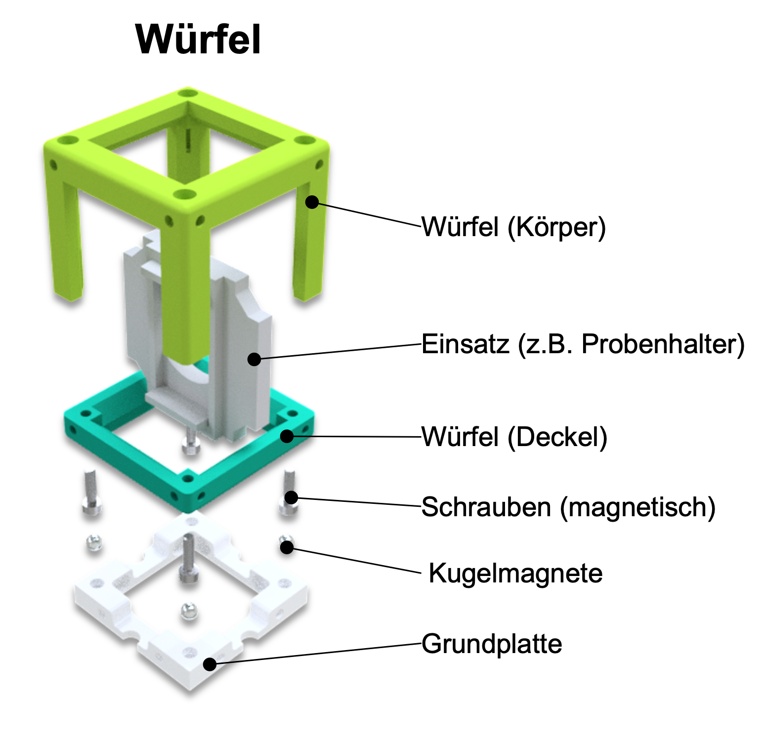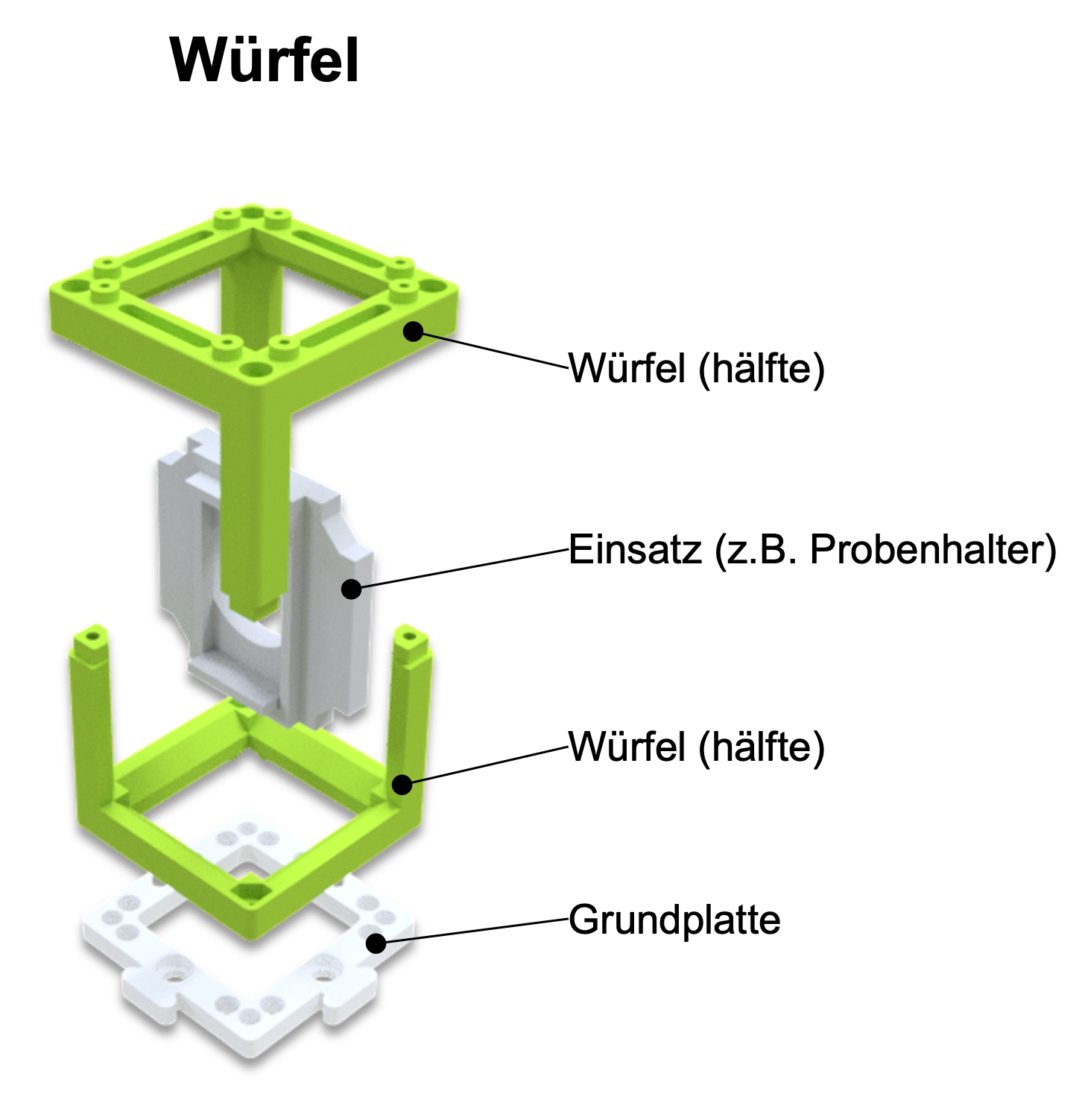 L'elemento centrale del progetto UC2 è un semplice cubo. Il cubo è costituito da due metà e ospita un inserto scorrevole. L'inserto può contenere vari componenti ottici (ad es. lenti, specchi), il che significa che diverse funzioni possono essere implementate con ogni cubo.