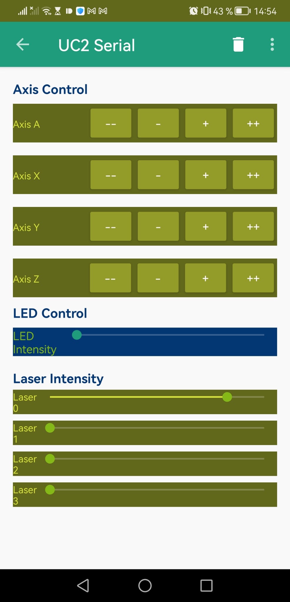 The UC2Serial app is a control interface for managing various hardware components of a modular microscopy or optical system, specifically using serial communication protocols. The app provides intuitive controls for adjusting motor positions across multiple axes, controlling LED and laser intensities, and configuring communication settings.