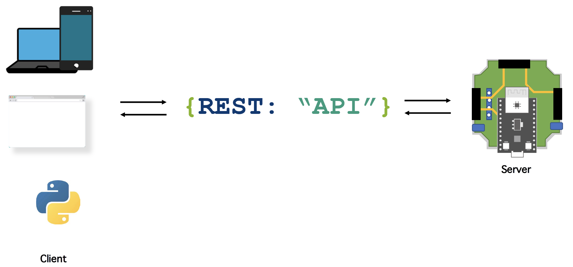 The unified "REST-API" (inspired, not following full protocol), enables you to control the functionalities from multiple different clients (e.g. Python, Webrowser, Android Phone). The Core idea is to file post/get requests (serial/wifi) that send/receive JSON files that do "something".