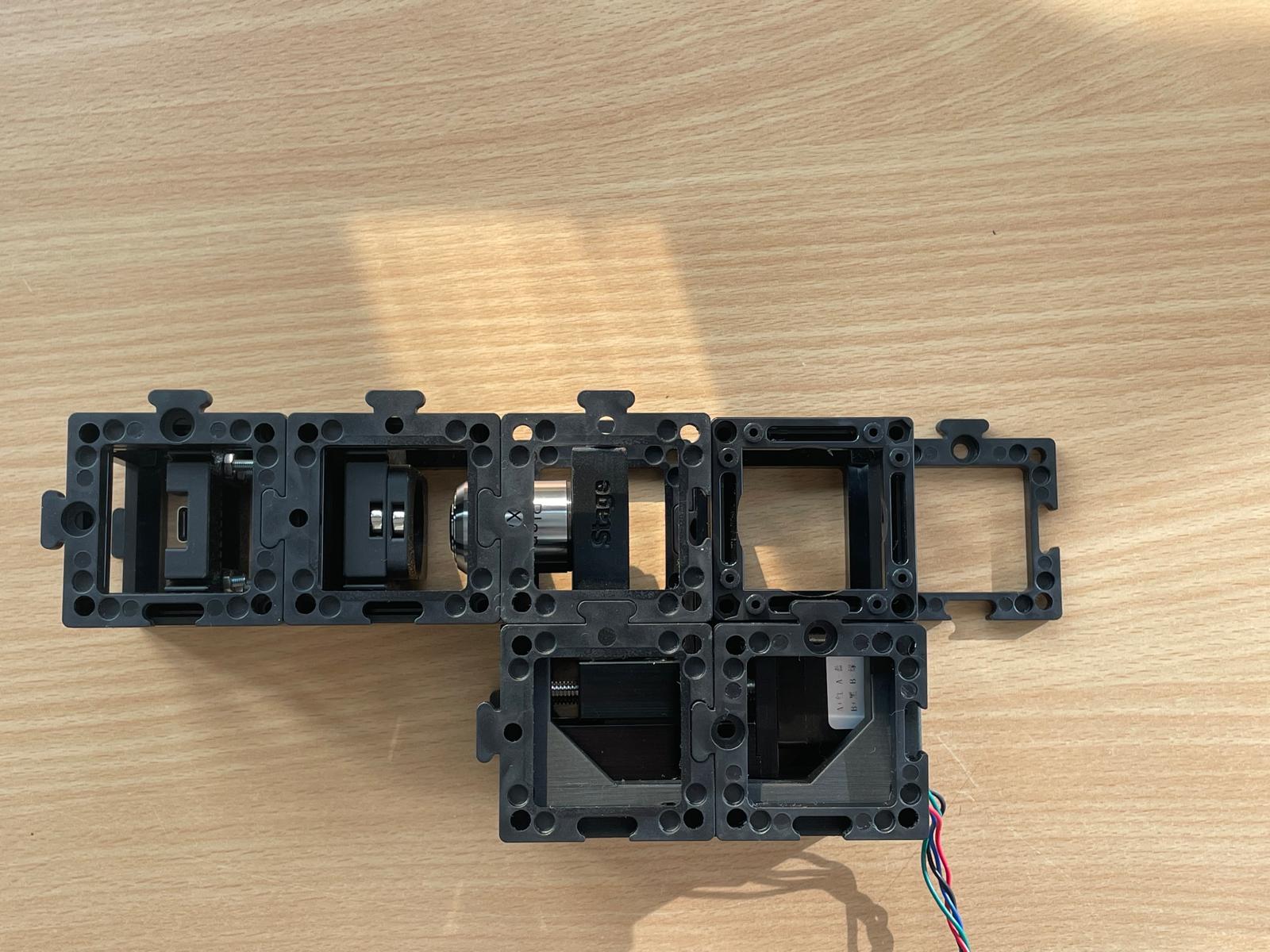 - Build the Baseplate: This will connect the LED-matrix, probe insert, movable infinity objective, beamsplitter and the camera (which is already connected to the tube lens).Attach wo extra baseplates for the Z-stage.