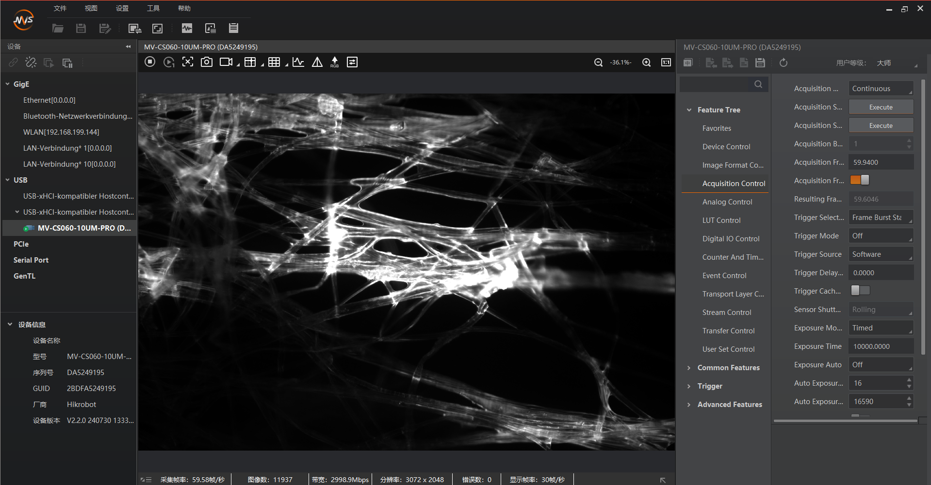 Acquisition Control, and increase theExposure timeto 300000 ms. You should now see the fluorescence image. Optional you can go toAnalog Control, and increase theGain.