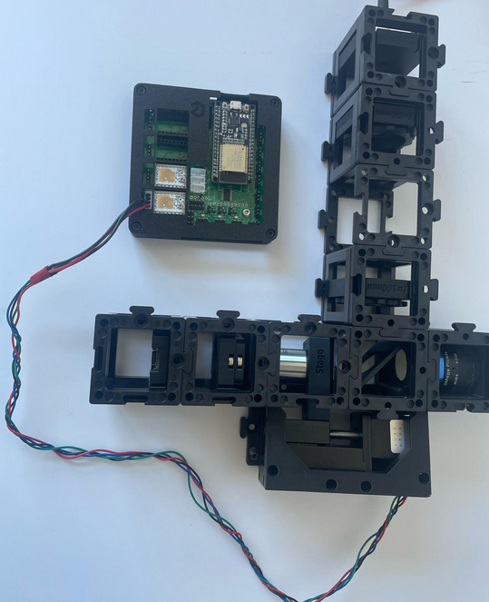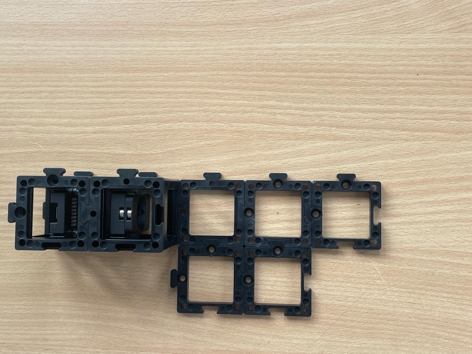 - Add the camera: Finally, attach the camera unit behind the beamsplitter and secure everything with a second layer of baseplates.