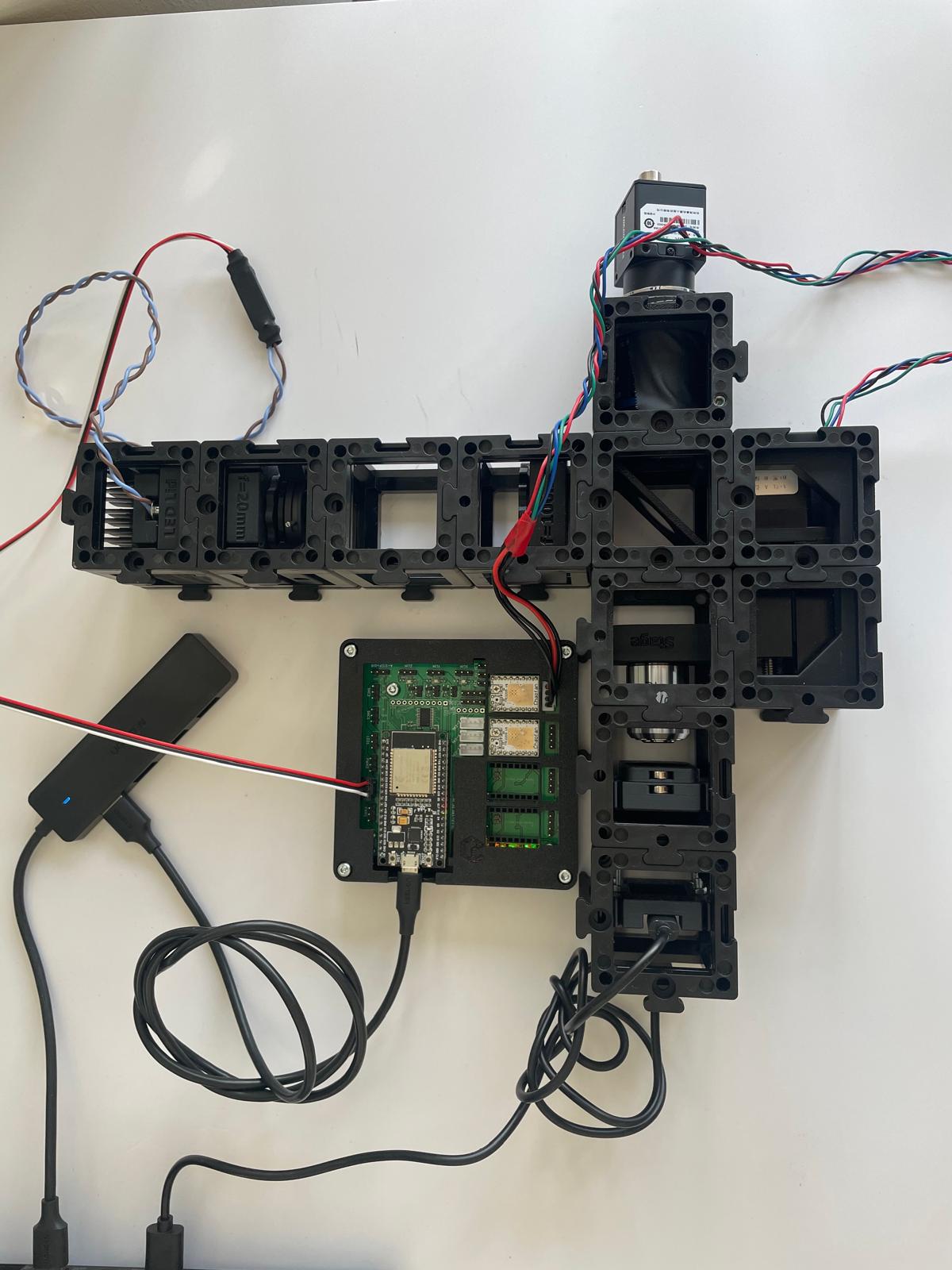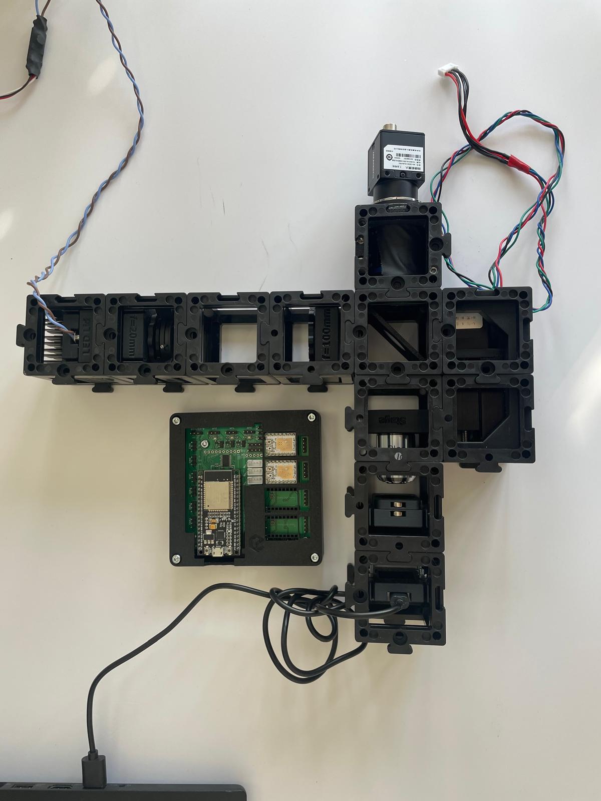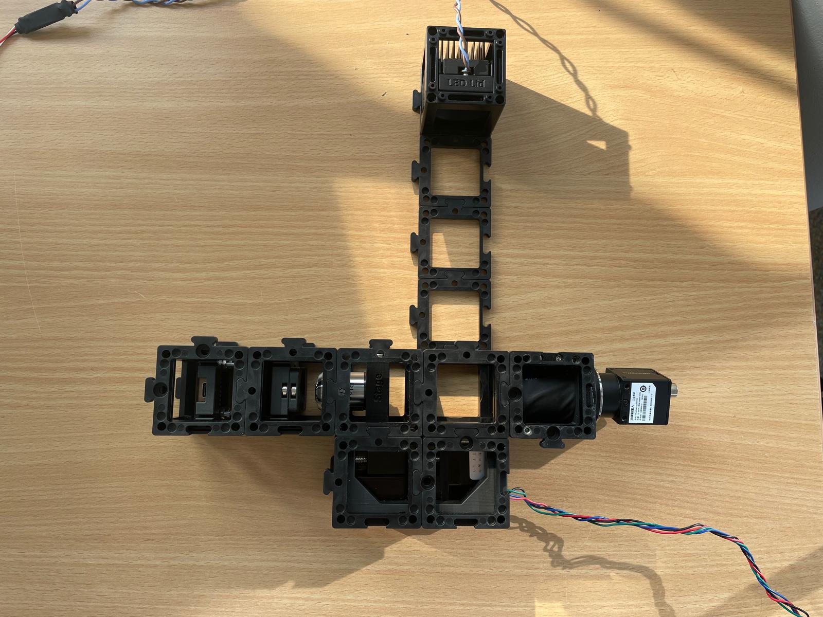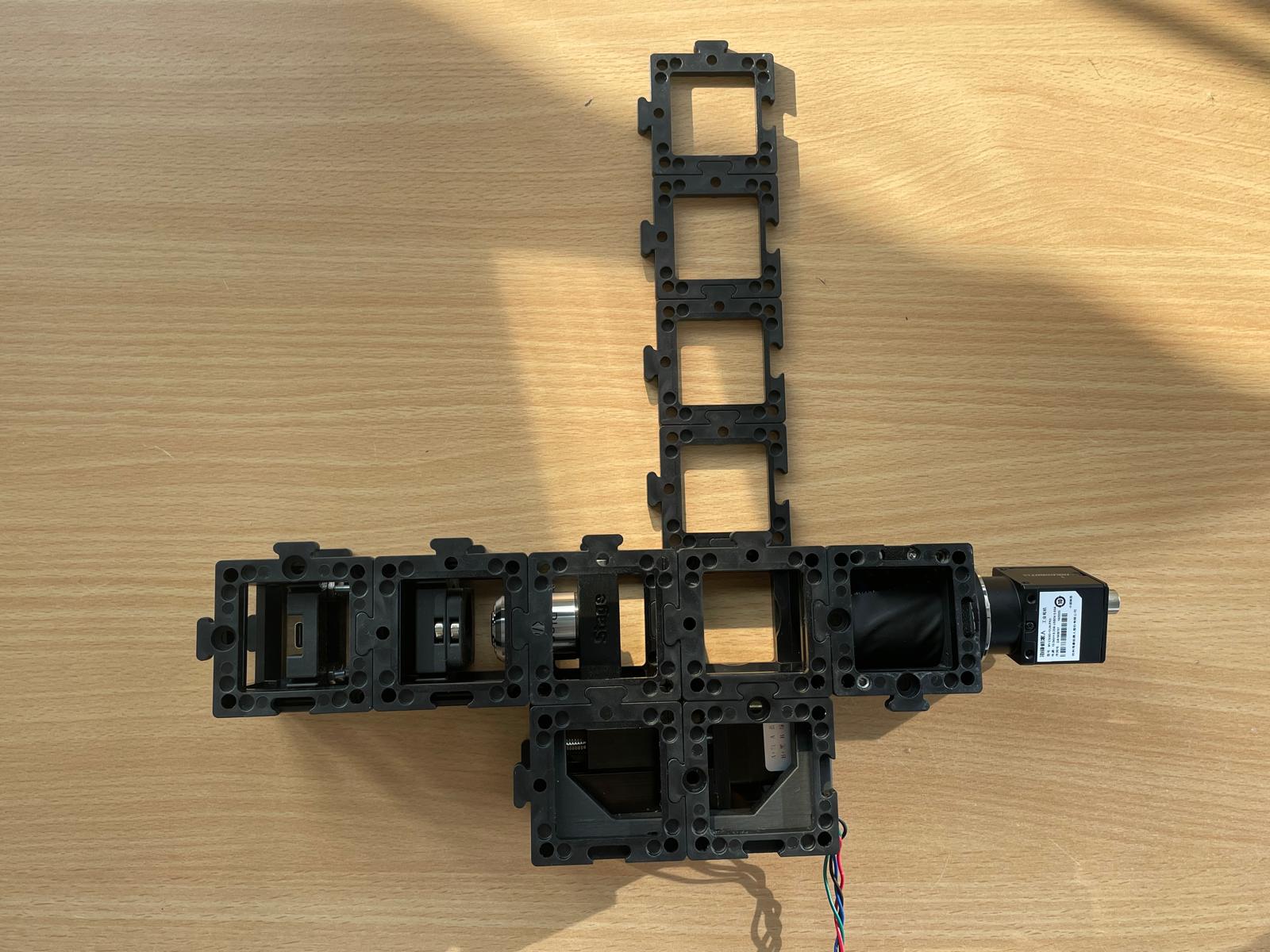 - Add the camera: Finally, attach the camera unit behind the beamsplitter and secure everything with a second layer of baseplates.