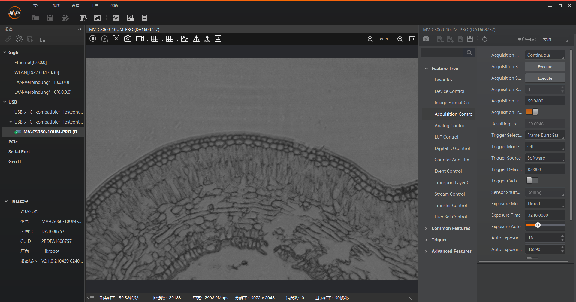 Acquisition Control, and increase theexposure timeto 300000ms. You should now see the fluorescence image. Optional you can go toAnalog Control, and increase theGain.