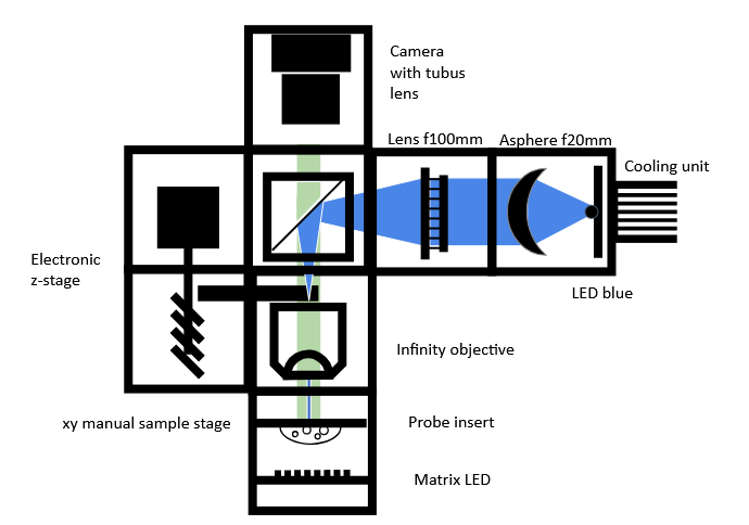 - To turn your microscope into a fluorescence microscope, turn the LED-matrix off and the blue LED on.
