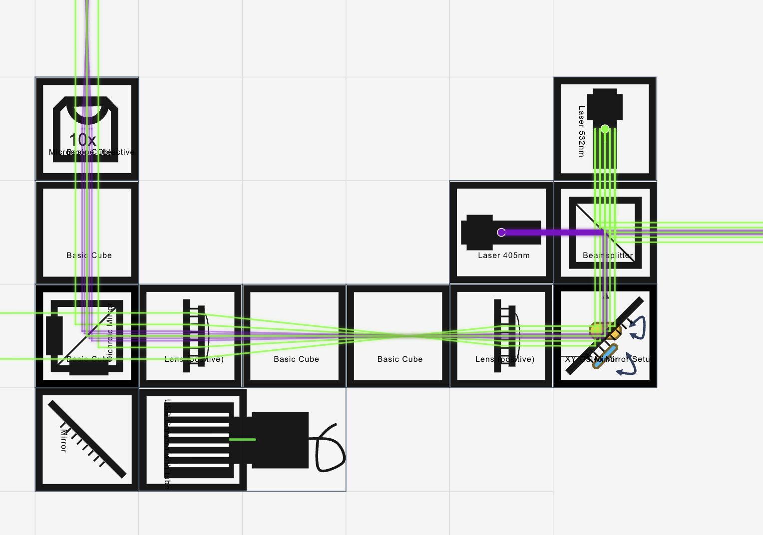 • Scan relay: scan lens (short f - we actually don't use a scan lens yet, maybe soon. This would produce a linear deflection of the beam based on the mirror angle) + relay lens (longer f) as a telescope -> objective BFP