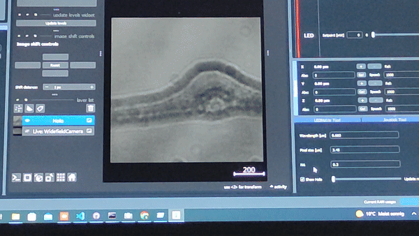 Using the In-line Holography plug-in widget in ImSwitch we can refocus the sample by using a propagator in reverse from the recorded hologram in real-time.