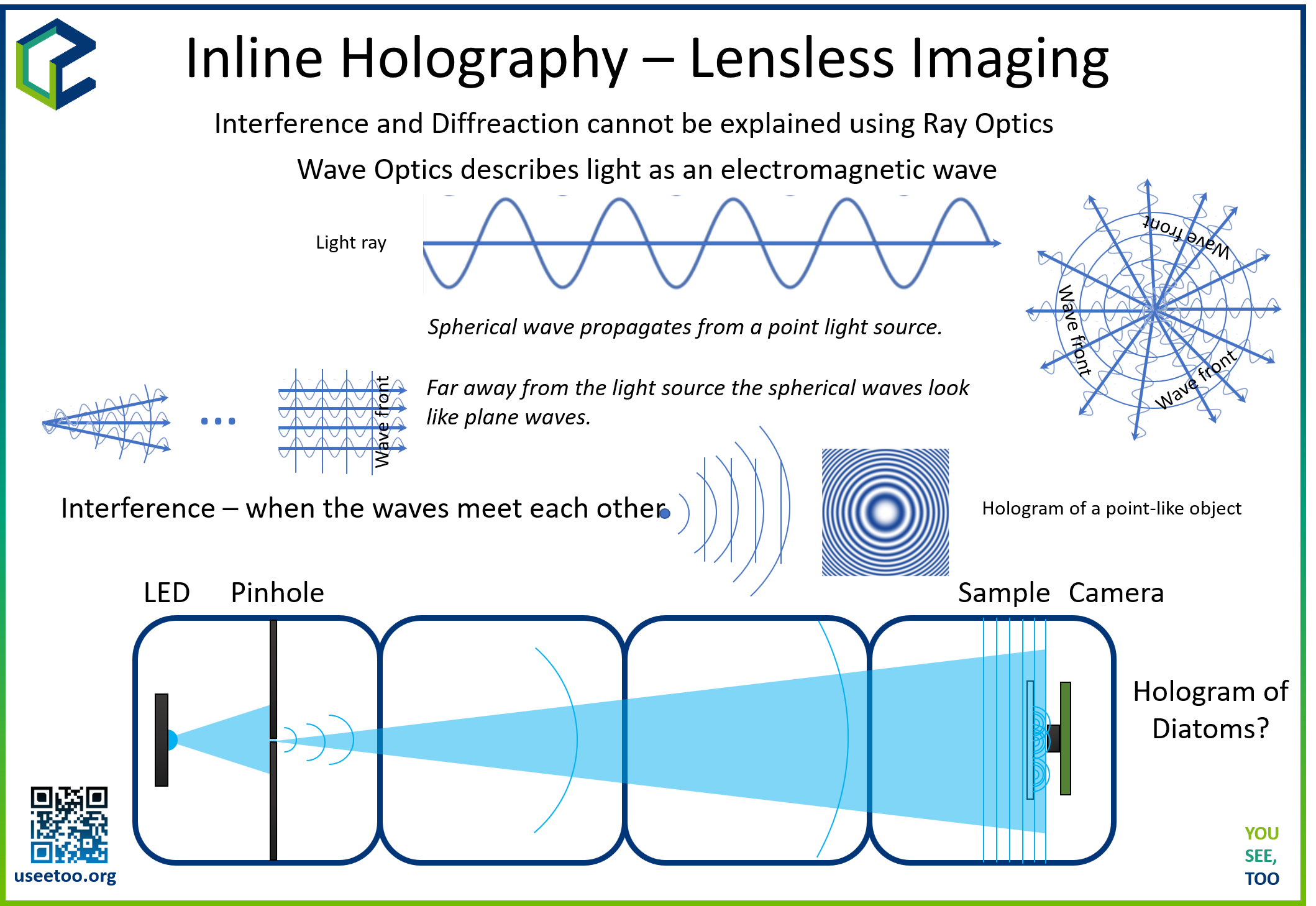 In this workshop, we will construct an inline holographic microscope using the UC2 modular microscope toolbox. Inline holography is a lensless imaging technique that uses coherent light interference to capture and reconstruct 3D images of transparent samples. This experiment demonstrates fundamental principles of wave optics, Fresnel diffraction, and digital image reconstruction while providing hands-on experience with modern computational imaging techniques.