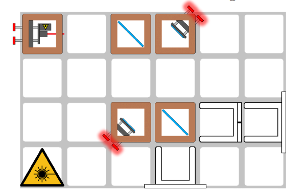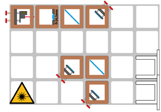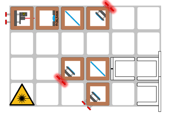 - Add two beam splitters and two 45° mirrors and adjust them so that both beams hit the pinhole centered.