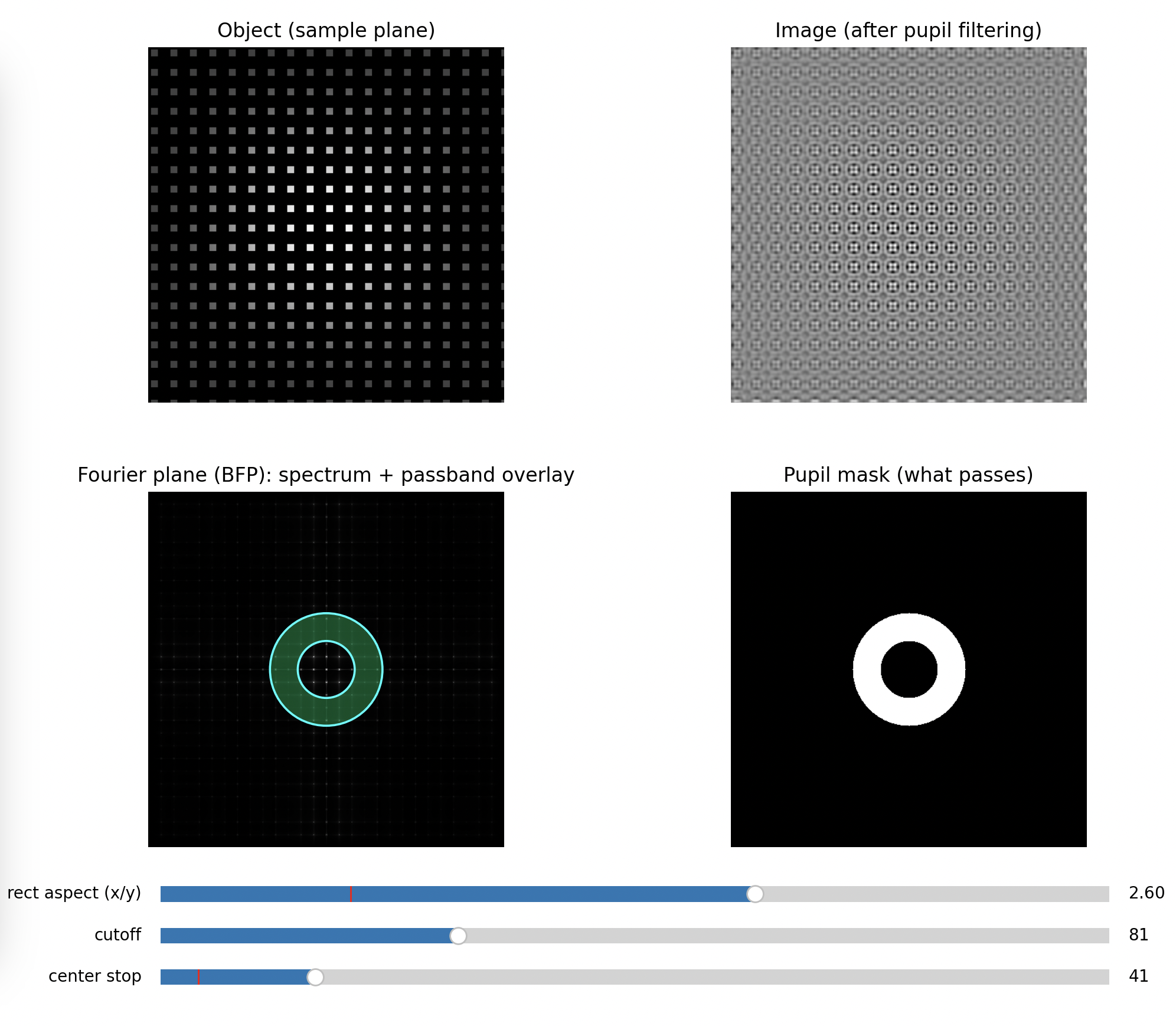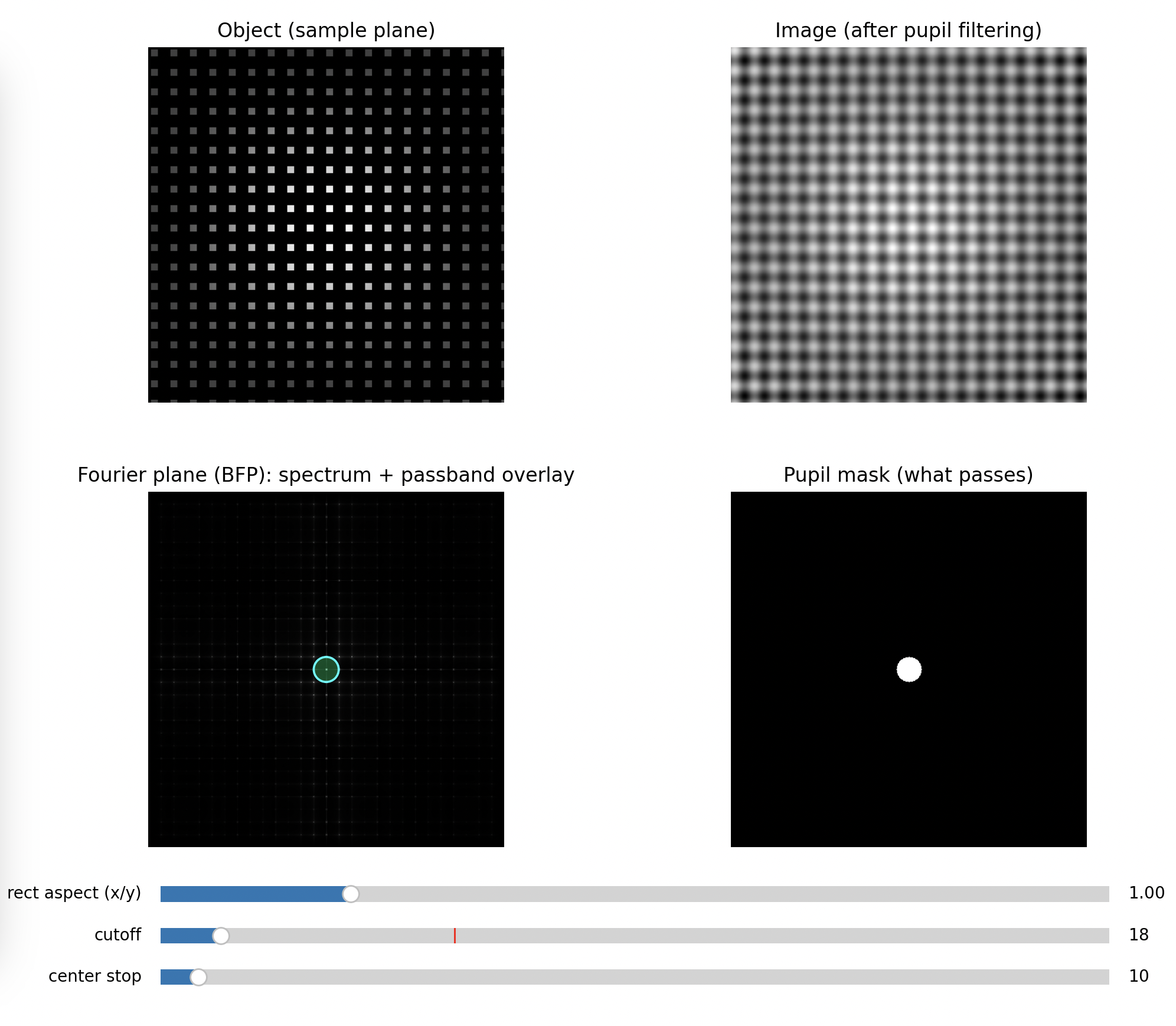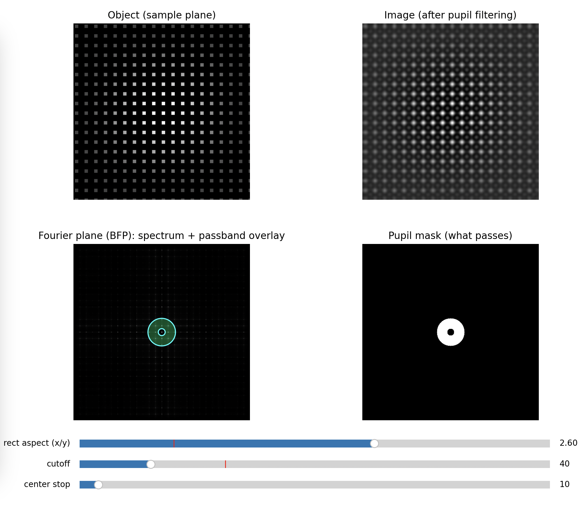 This is why the illumination model matters: the same optics can behave as if they had a different “information bandwidth” depending on coherence. Your UC2 setup makes this tangible because you can see and edit the frequency content directly in the BFP.