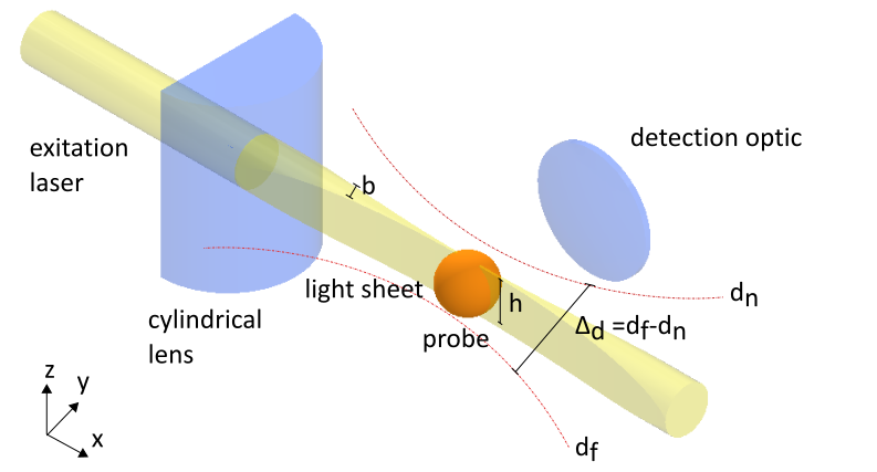 Refer again to the alignment diagram that shows how the light sheet should intersect the detection path. The focal point of the light sheet (its thinnest part) must coincide precisely with the optical axis of the detection optics.