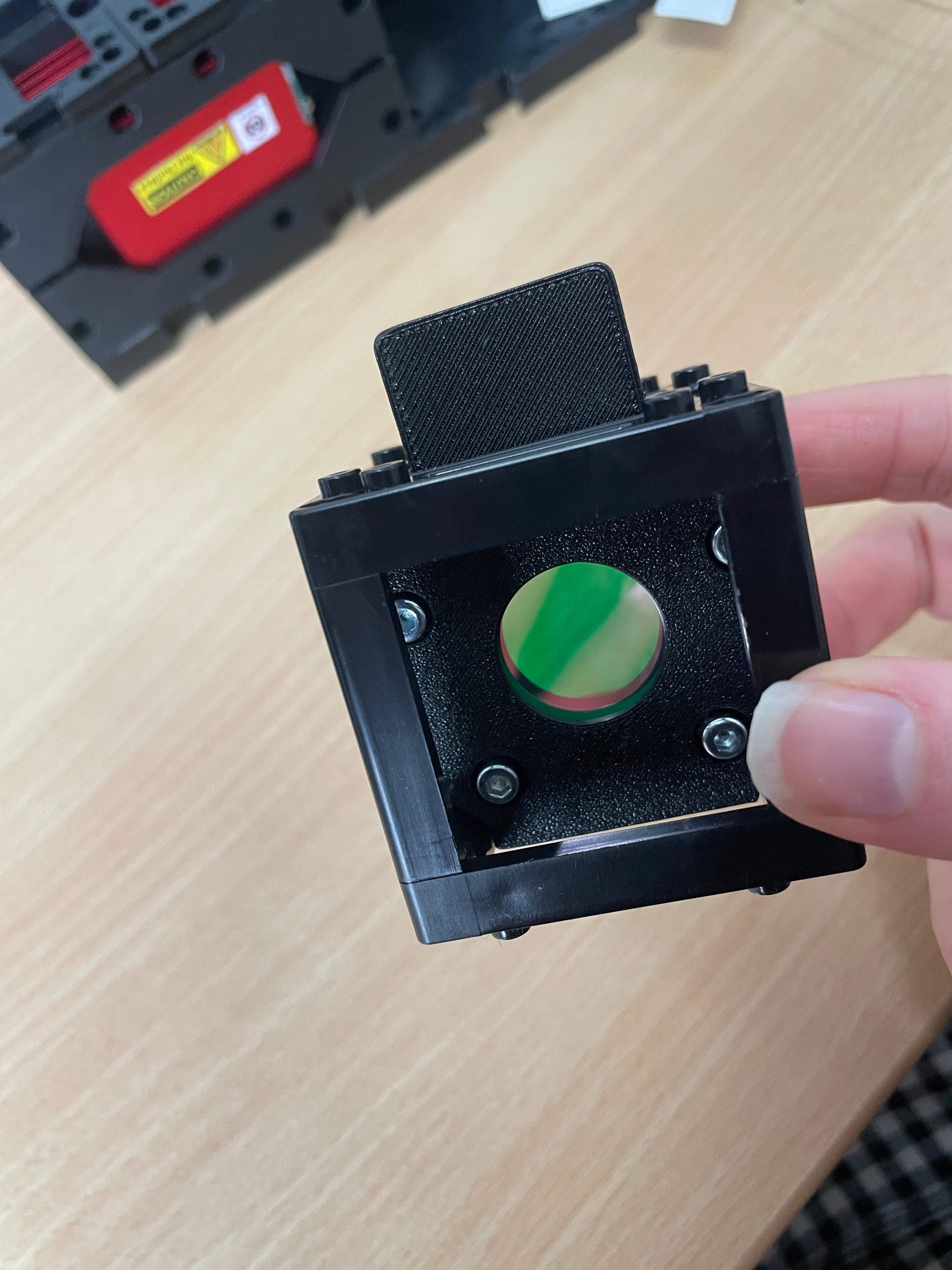 - Otherwise, locate the filter inside the beamsplitter cube insert from the FluoBox. It’s on the rear-facing side; the diagonal face holds the dichroic mirror. Disassemble the beamsplitter to retrieve the emission filter and insert it into its designated mount. Secure it with the white retaining ring.