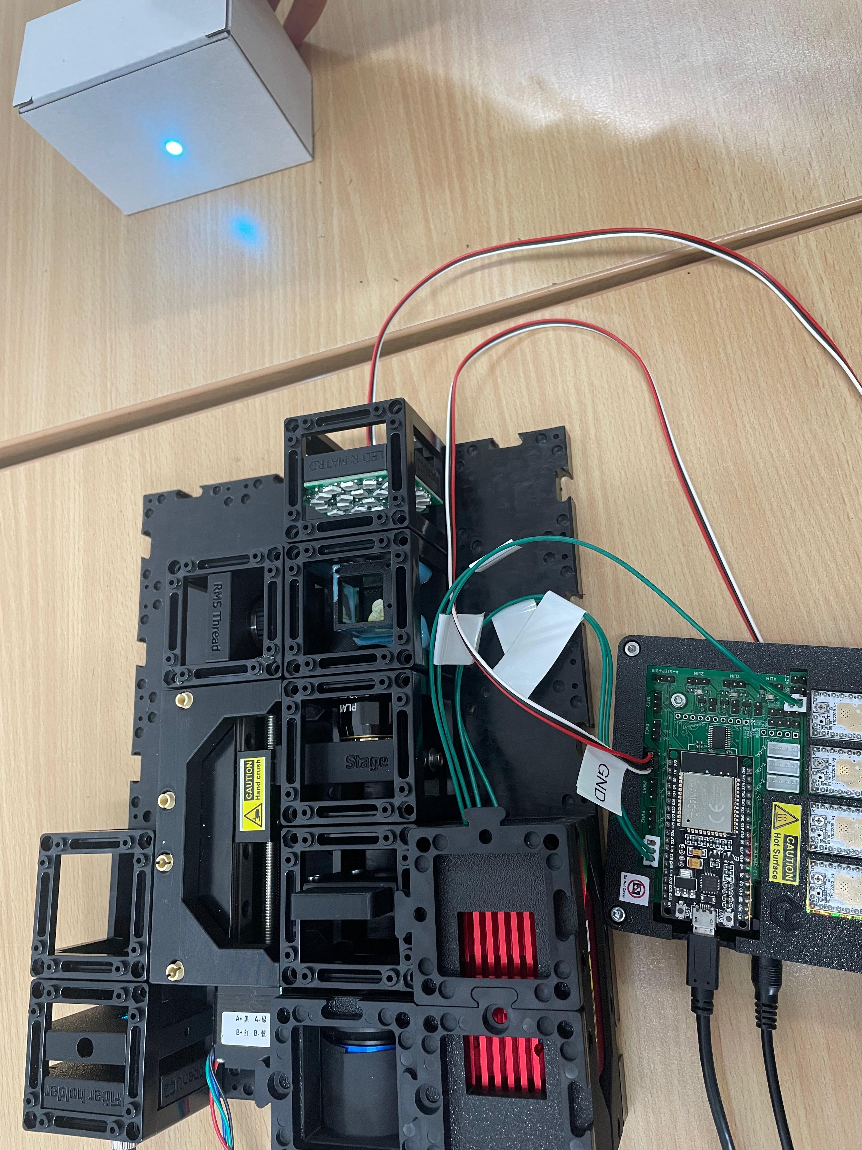 This command will move the Z-axis motor by -1000 steps (1 full rotation) at a speed of 1000 steps per second. Each step corresponds to a movement of 300nm when using microstepping. You’ll observe the motor rotating, adjusting the focus.