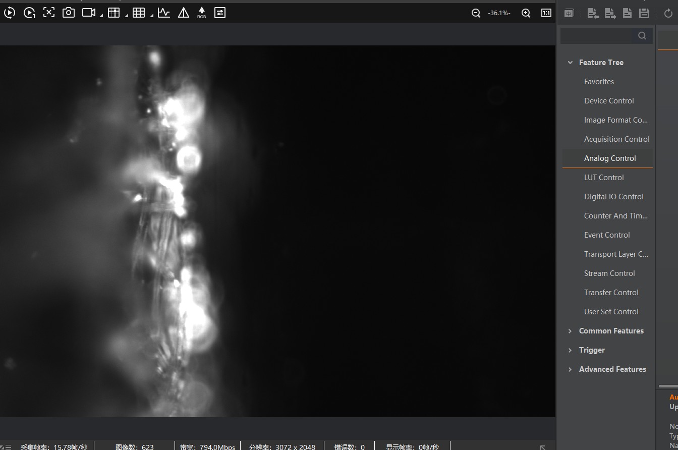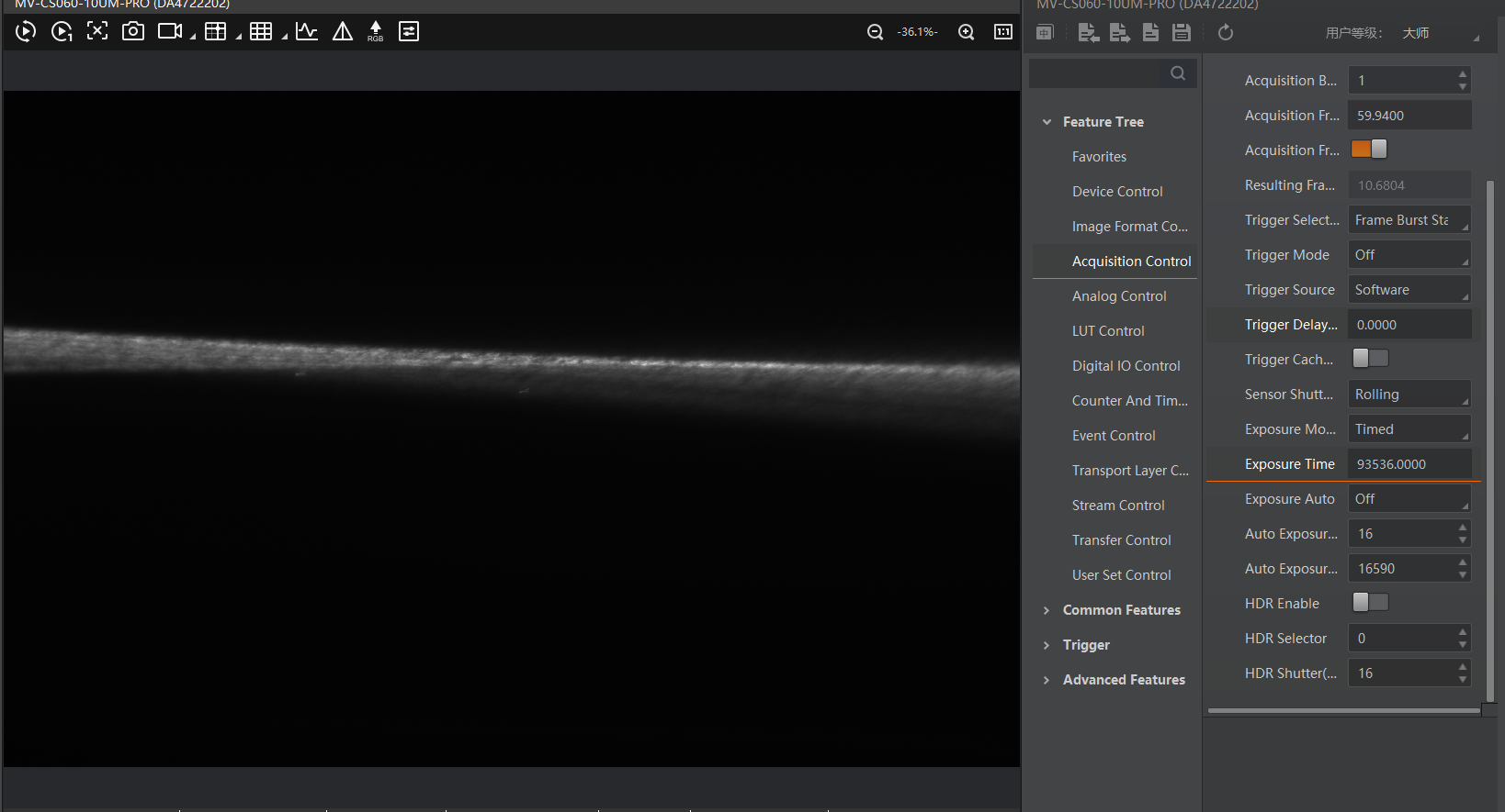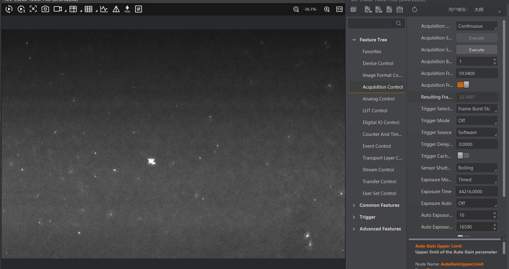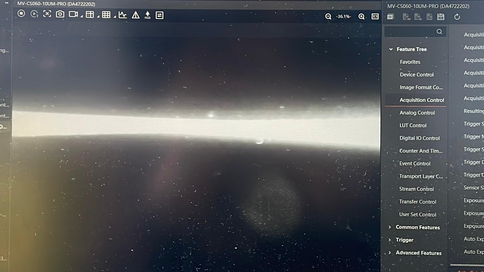 Adjust exposure time and gain as necessary.