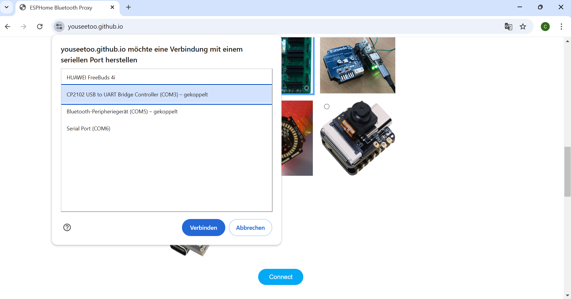 In your Chrome browser, a dialog will prompt you to select the COM port for your ESP32, which should be shown as