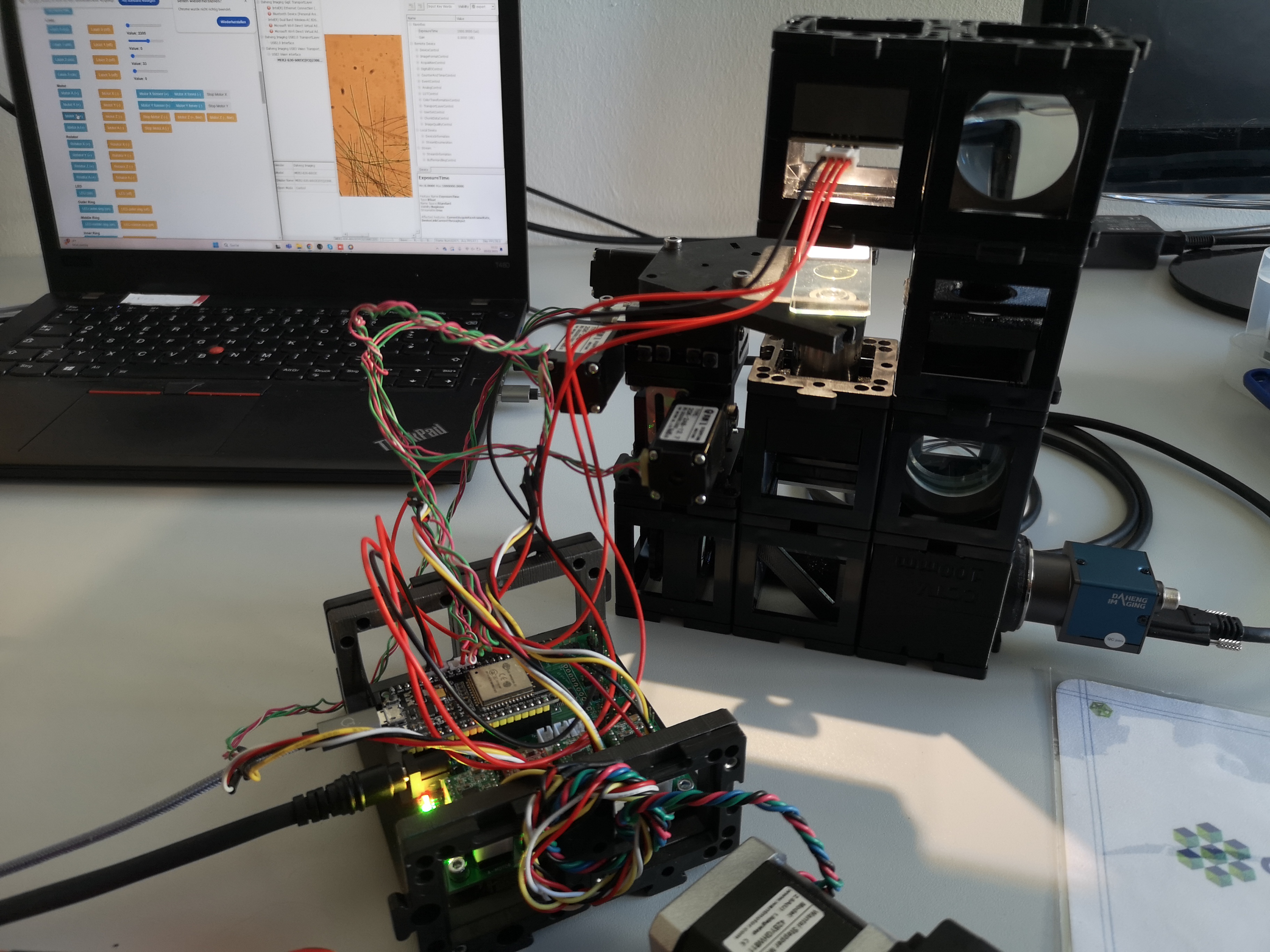 The XYZ Micrometer Stage, branded as "openUC2 XYZ Stage," is a highly accurate motion control device designed for precise manipulation in three dimensions (XYZ). The stage is primarily intended for use in microscopy applications and interferometers, where precise sample positioning is essential. It offers microstepping control with a step size of approximately 320 nanometers in all directions, enabling micron-level adjustments.
