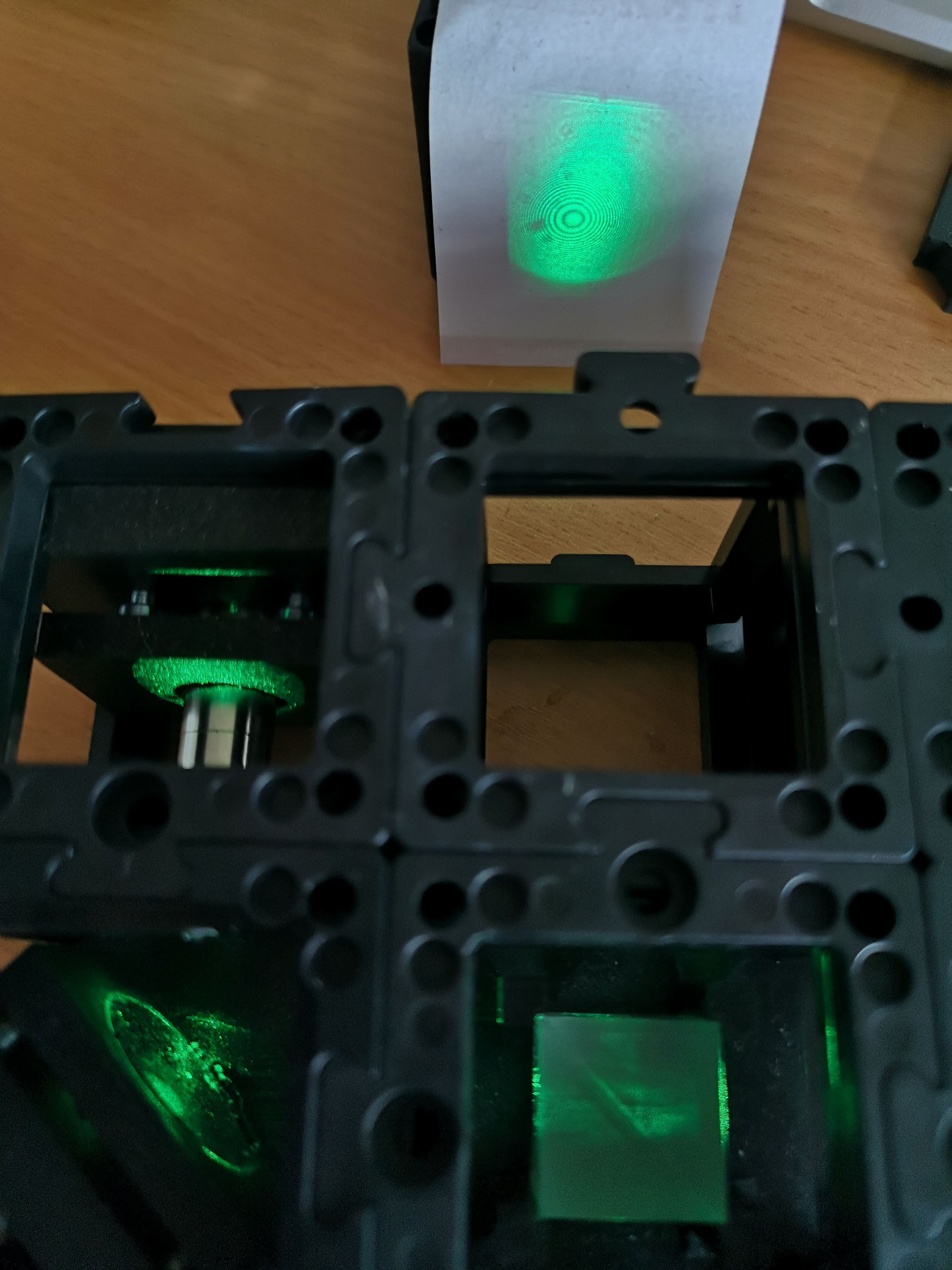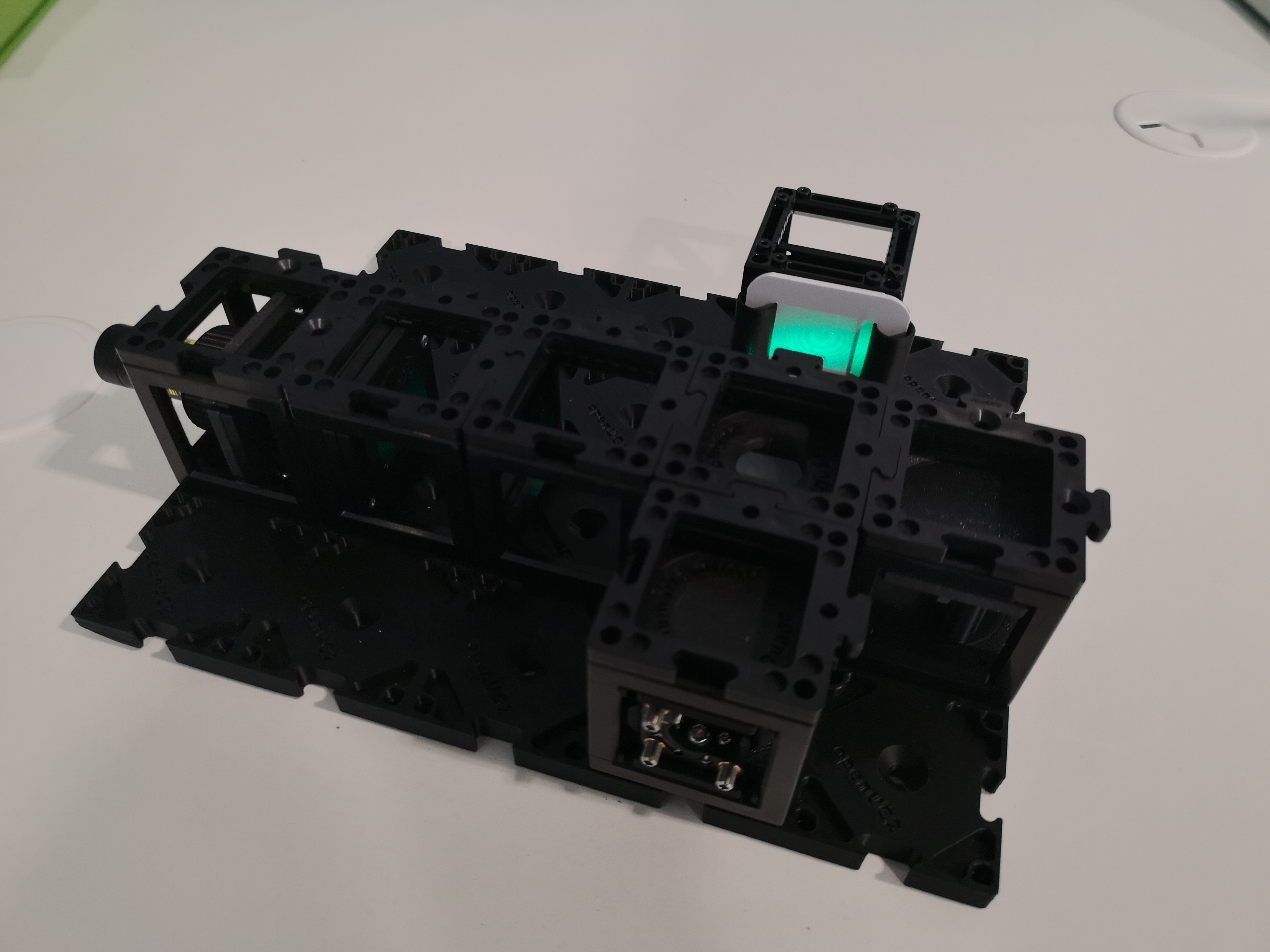 Picture of older setup with camera - Fully assembled UC2 interferometer with green laser diode, camera, beamsplitter, kinematic mirror and translatable mirror