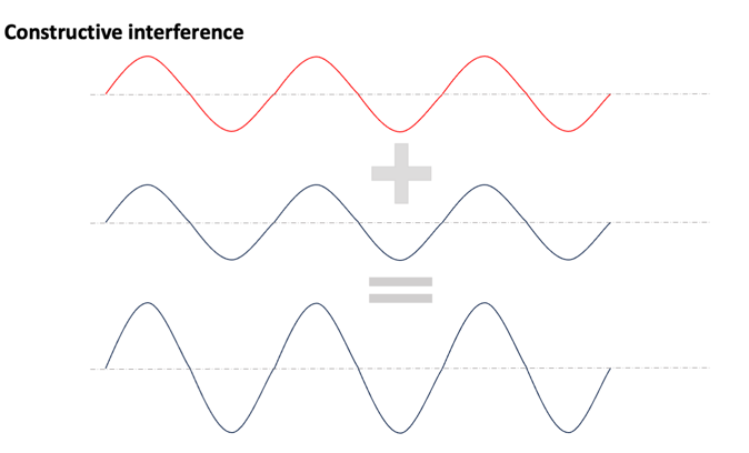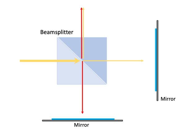 if we extend the beam splitter by to mirrors the split light is reflected back to them. the consequence that the two parts of the light unite again and form a new wave. This is called Interference.