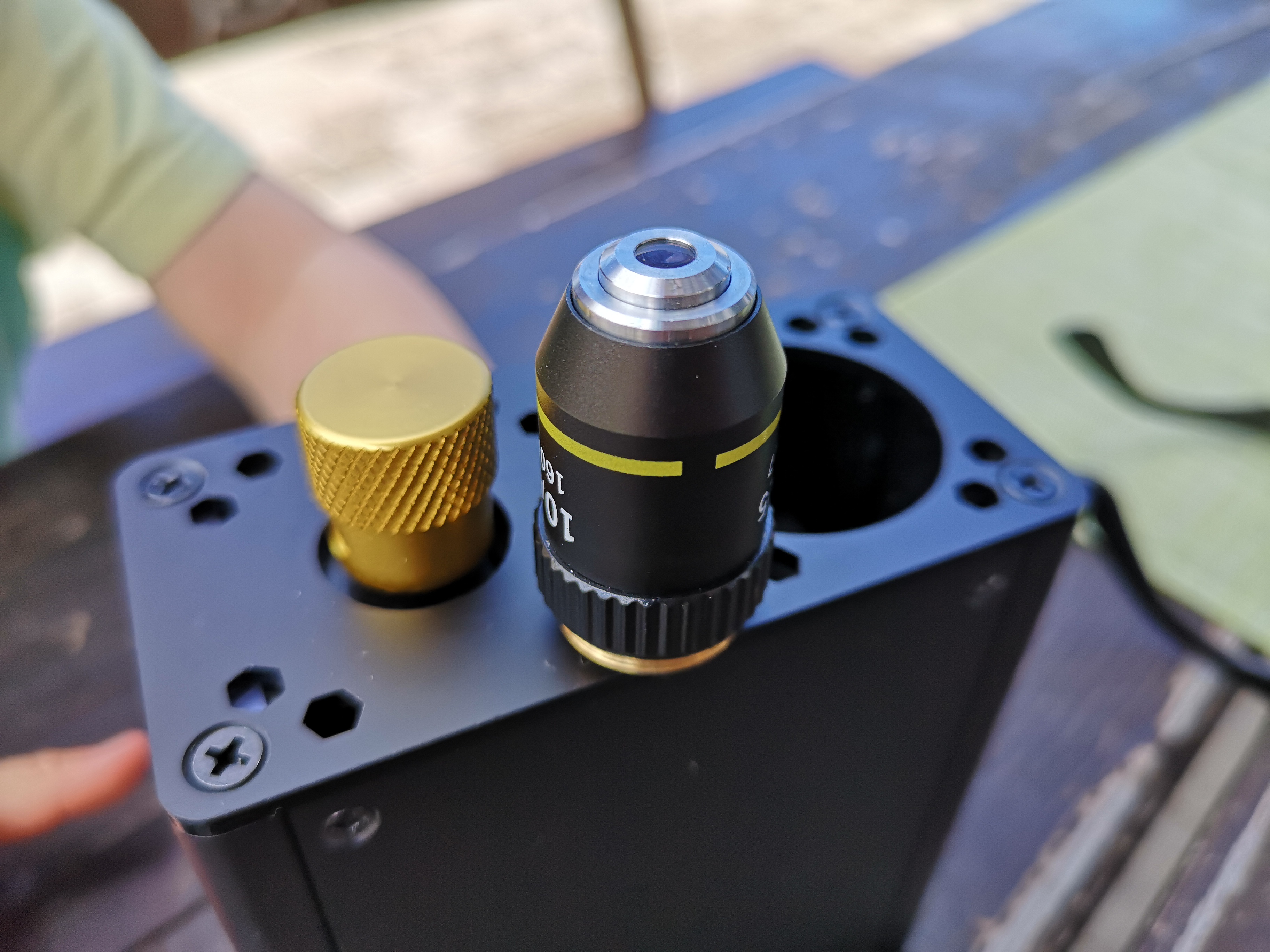 The objective lens can easily be swapped by unscrewing it from the RMS thread