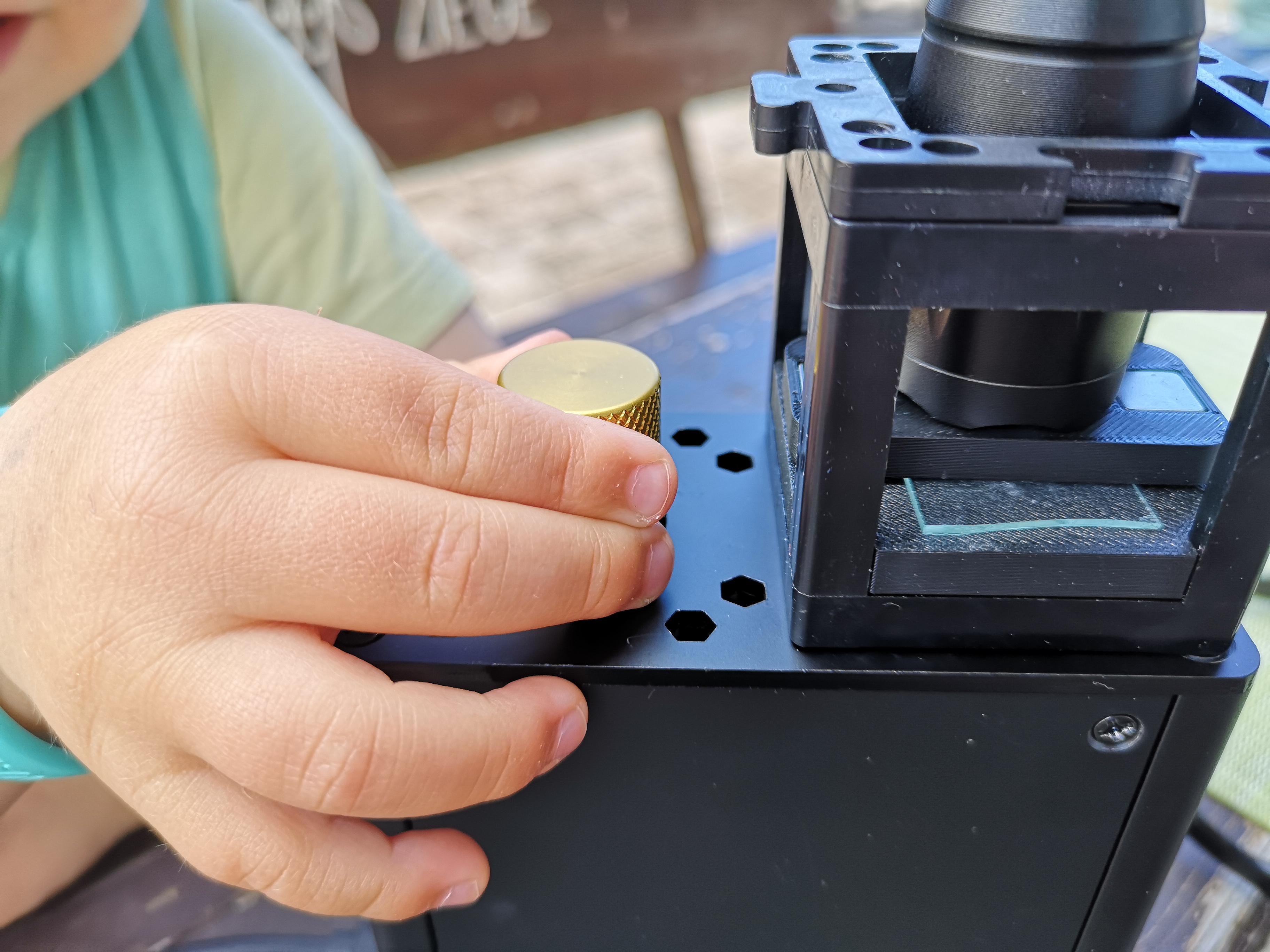 - Use the focus knob to move the objective lens up and down while observing the live stream for changes in contrast and sharpness.