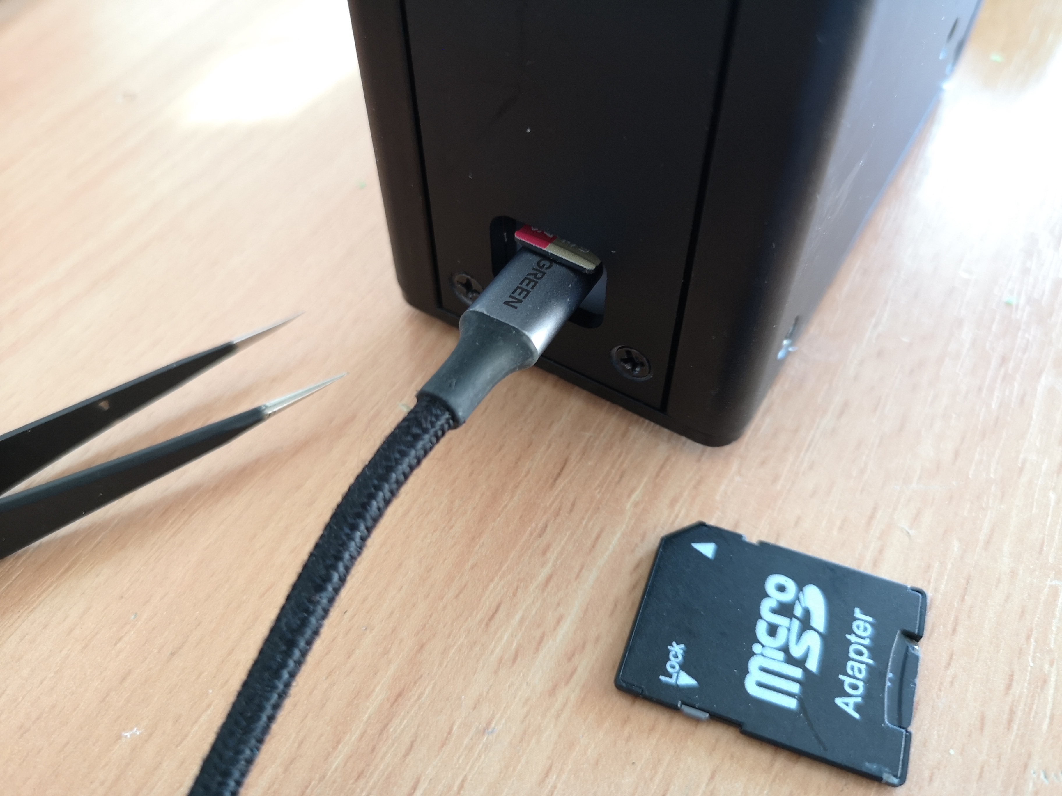 - Insert the SD card into the SD card slot on the Xiao device. The slot is larger than the card, so using tweezers can help with precise insertion.