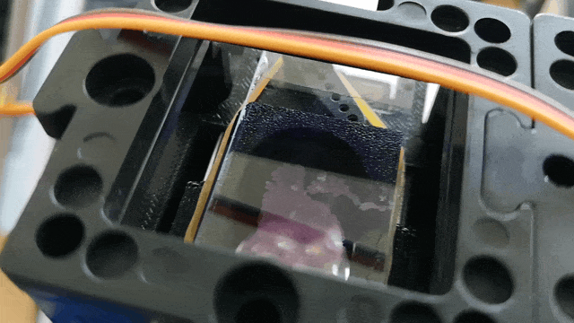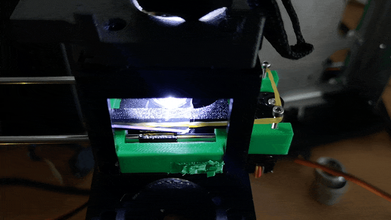 Stage scanning allows the automatic movement of the sample to enlarge the visible field. We use a simple servo motor to move a rubber-band-fitted sled, carrying the sample along an axis. This method provides a reliable movement path using steel rods salvaged from old CD/DVD drives.