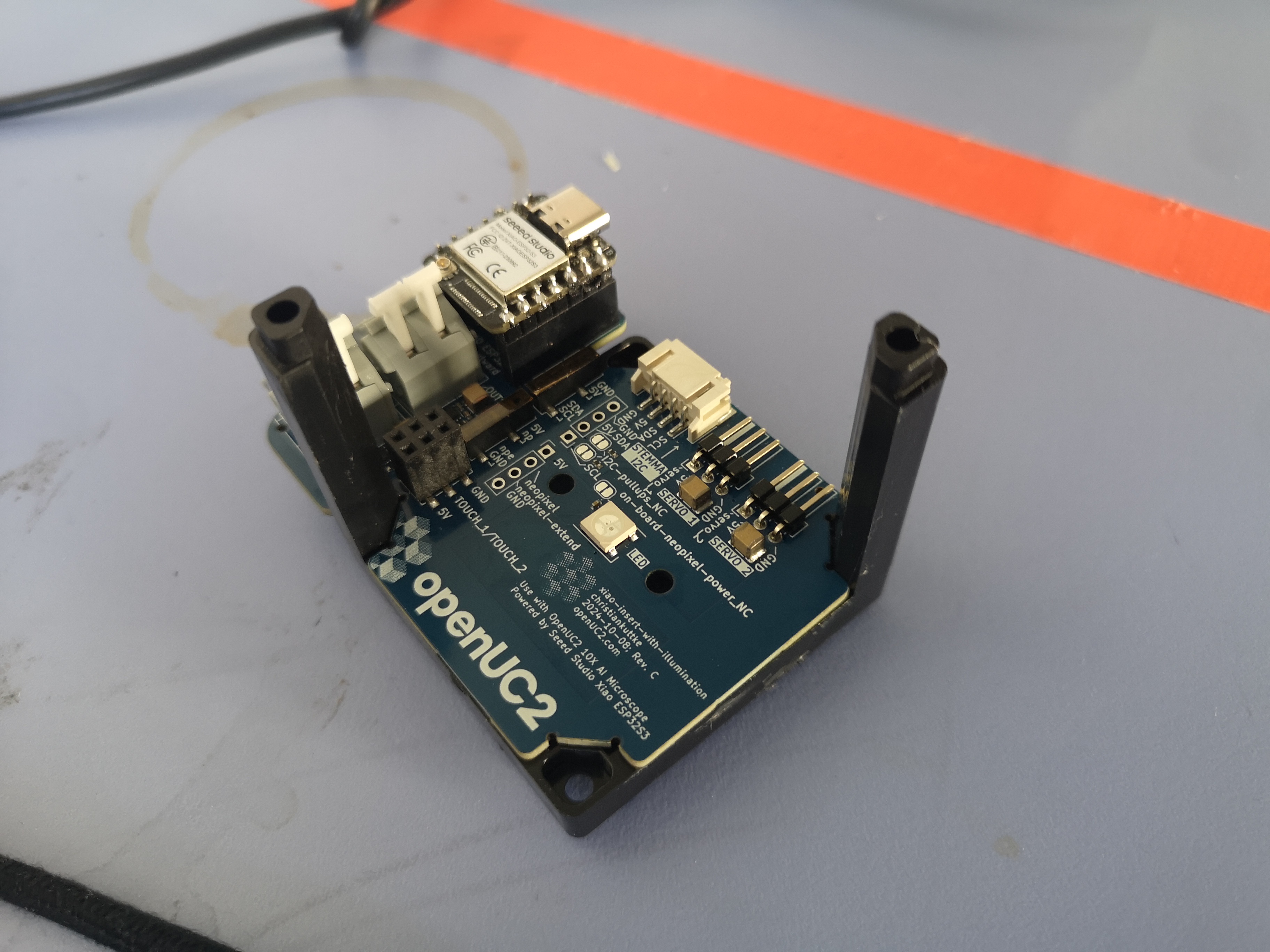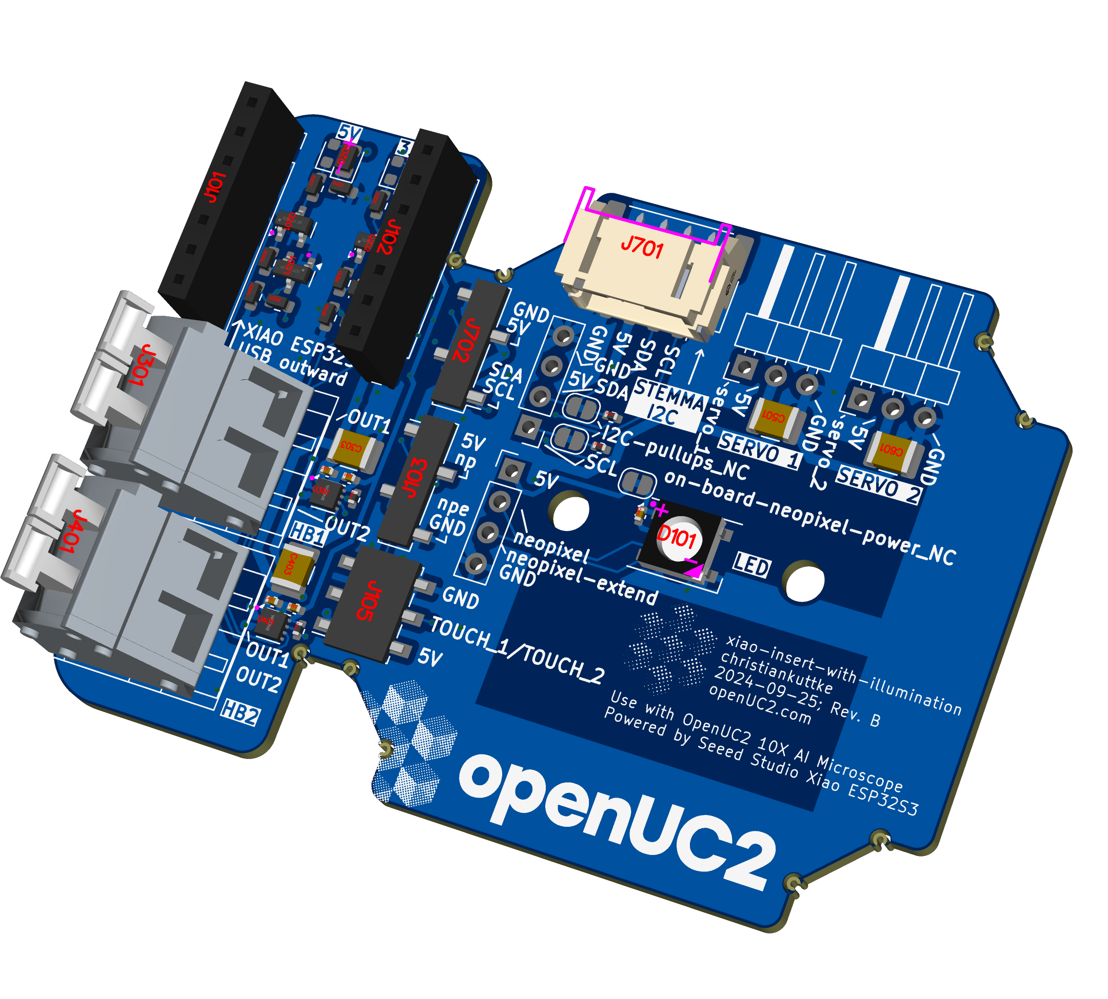 - Seeed Studio Xiao ESP32S3: A small ESP32-based microcontroller module, mounted via header sockets. The microcontroller is responsible for handling the firmware (UC2-ESP) and communicating with the peripherals.