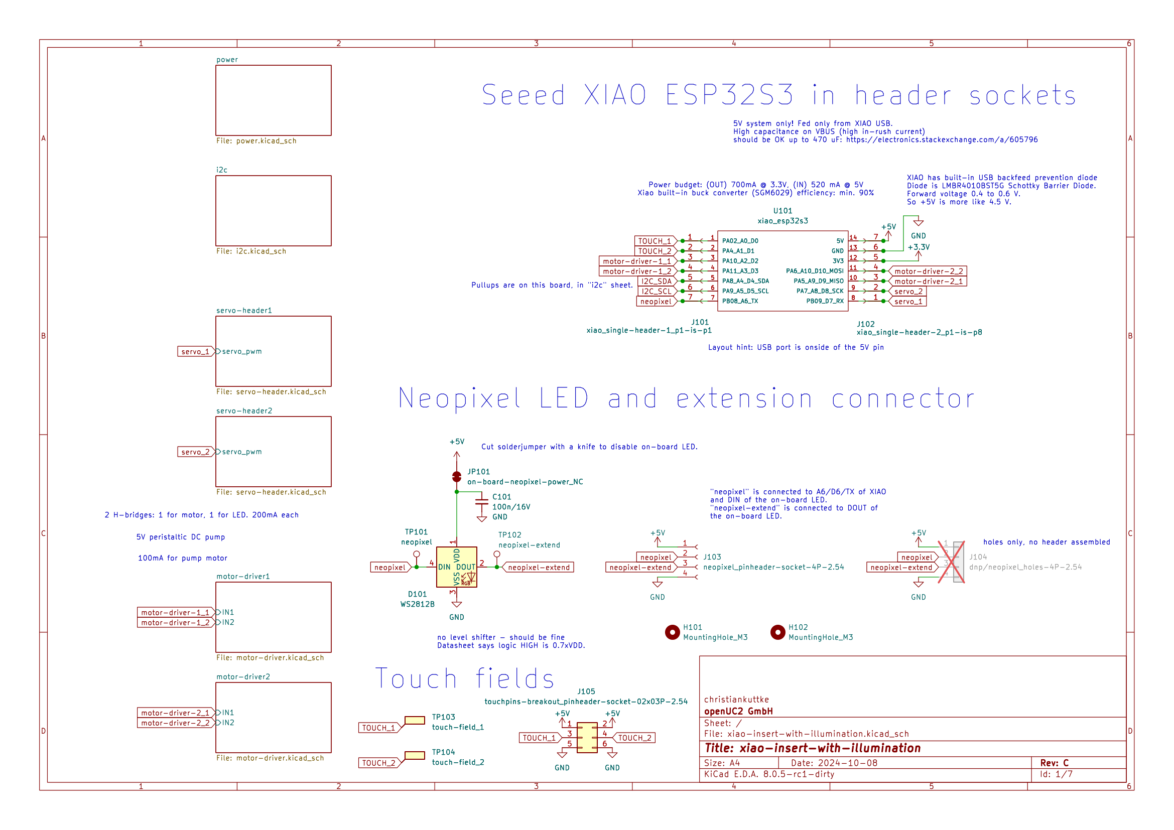 This PCB connects a Seeed Studio Xiao ESP32S3 module to the openUC2 modular cube system. It features a range of components for illumination and control of motors or servos, providing an I2C bus for integration with the UC2 ecosystem. The board is primarily designed for controlling a motorized system such as peristaltic pumps and driving Neopixel LEDs, with additional support for PWM-driven components and touch inputs.