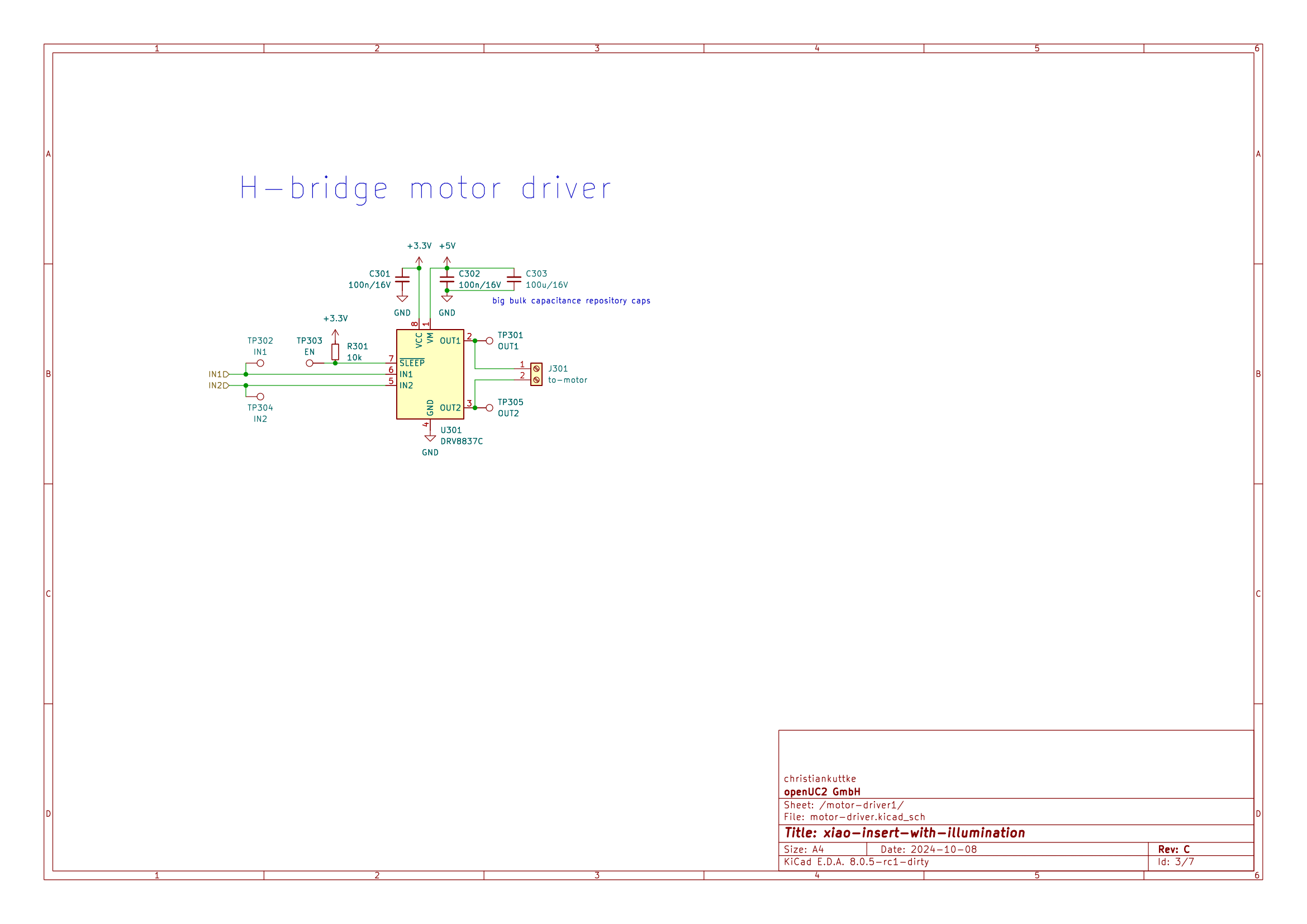 - Motor drivers controlled via IN1 and IN2 lines from the Xiao, providing forward/reverse motor control.