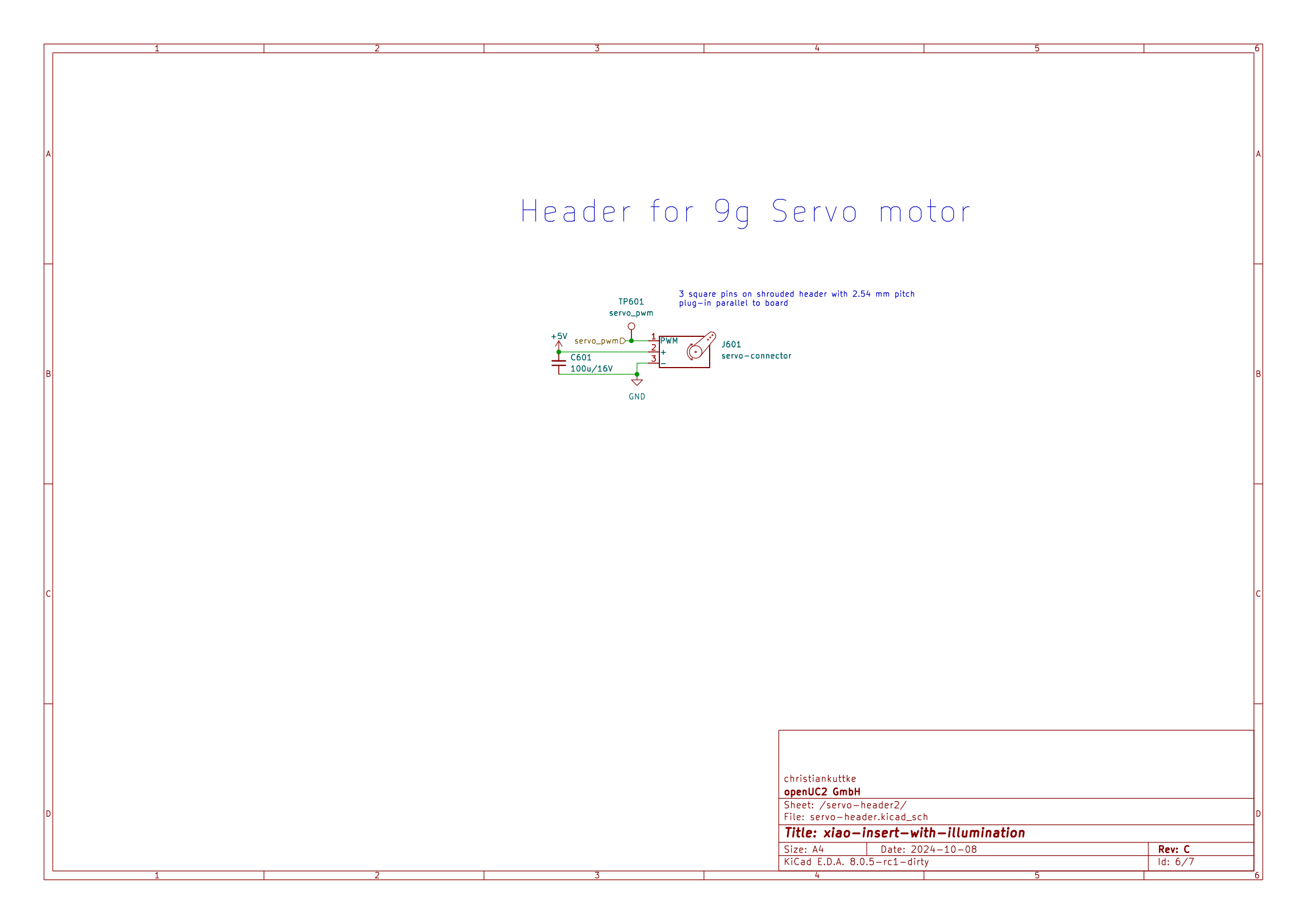 - Each header provides power, ground, and a PWM signal from the Xiao, supporting standard 9g servos or similar devices.