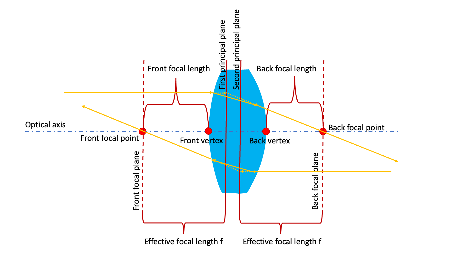 - Lenses: Defined by focal length (f), characterizing the deflection of light
