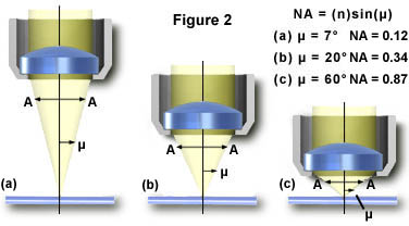 NA = n sin θ, where n is the refractive index, θ is the angle of steepest rays - Resolution: The smallest distance between distinct points, calculated by